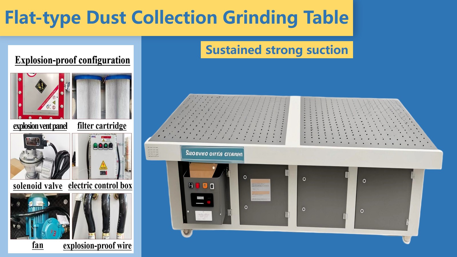 ماحول دوست اور موثر: فلیٹ دھول جذب کرنے والی سینڈنگ ٹیبل پیسنے کے منبع پر دھول کو دور کرسکتی ہے ، دھول بازی کو مؤثر طریقے سے کنٹرول کرتی ہے ، اور ماحول میں دھول کی آلودگی کو کم کرتی ہے اور آپریٹرز کی صحت کو پہنچنے والے نقصان کو کم کرسکتی ہے۔
